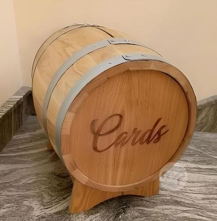 Refurbished 25 liter barrel with a slot that is generally positioned next to the guest book to serve as distinctive wedding card holders.