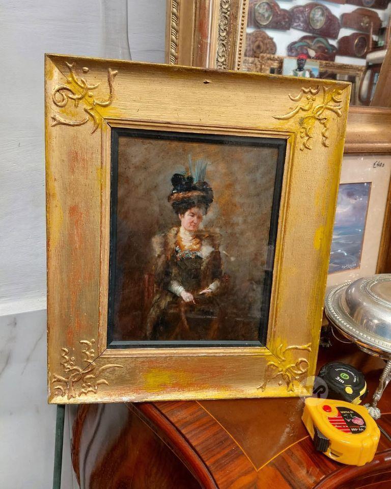An antique oil on board painting Showing a Noble lady, dressed in the period