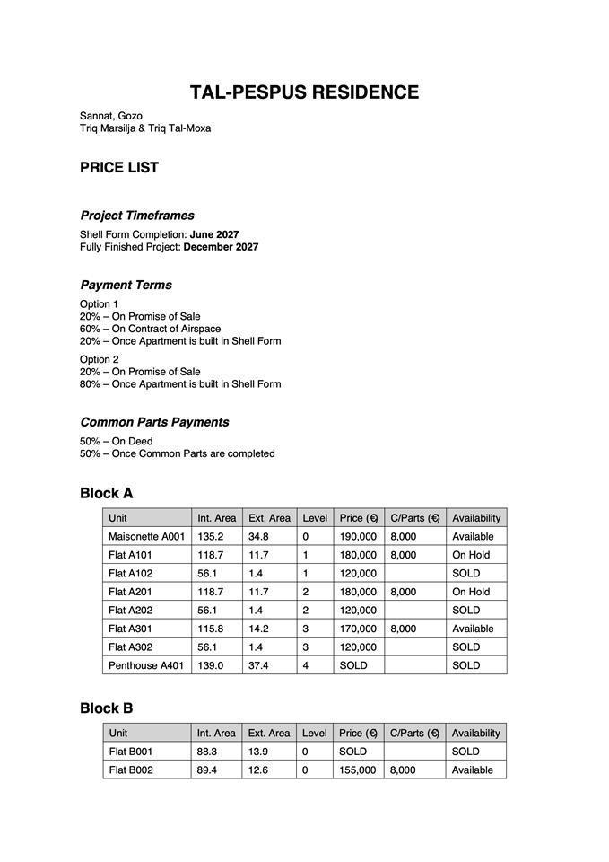 Tal-Pespus Residence is a residential development set across Triq tal-Moxa and Triq Marsilja in a quiet area of Sannat. Offering a range of maisonettes, apartments, and penthouses, the project is designed with practical layouts and a smooth blend of indoor–outdoor living.