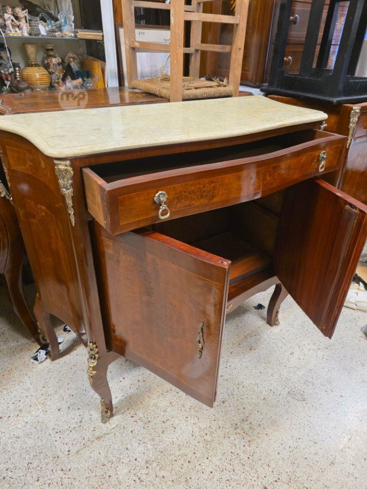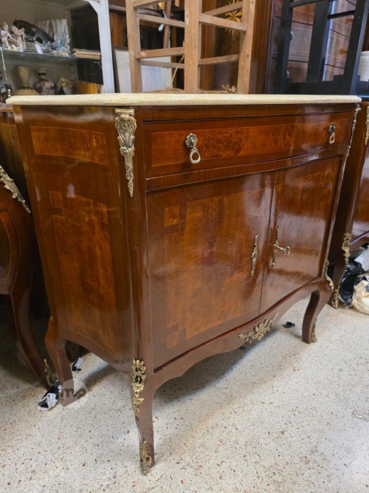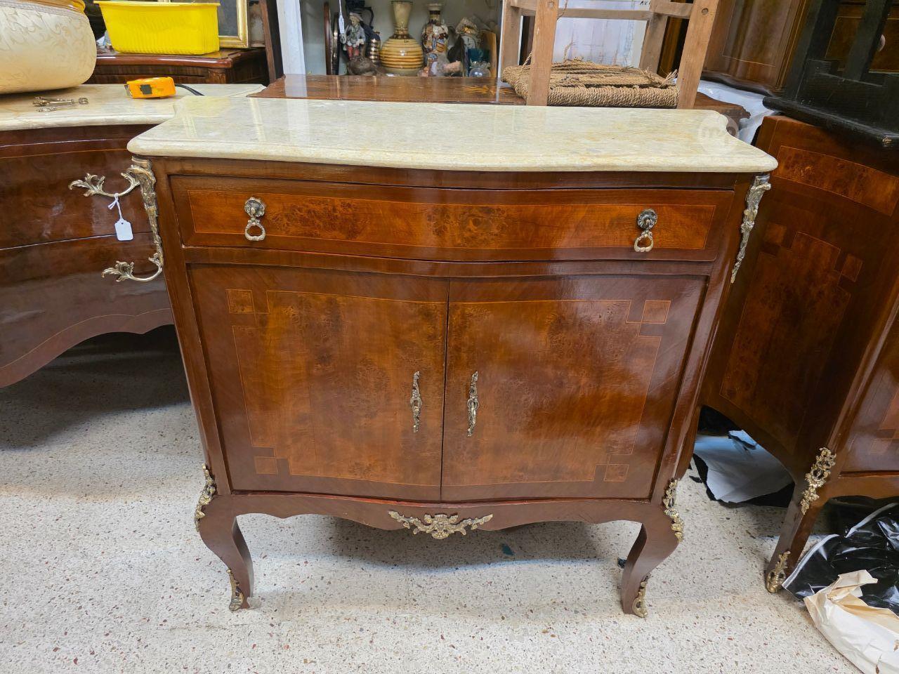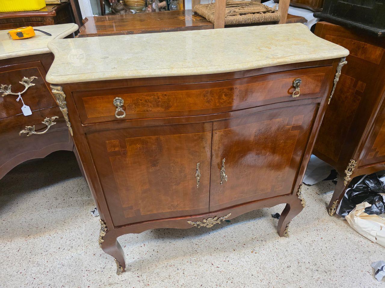 A French Louis XV style marble top salon cabinet with marquetry inlay and ormolu mounts.