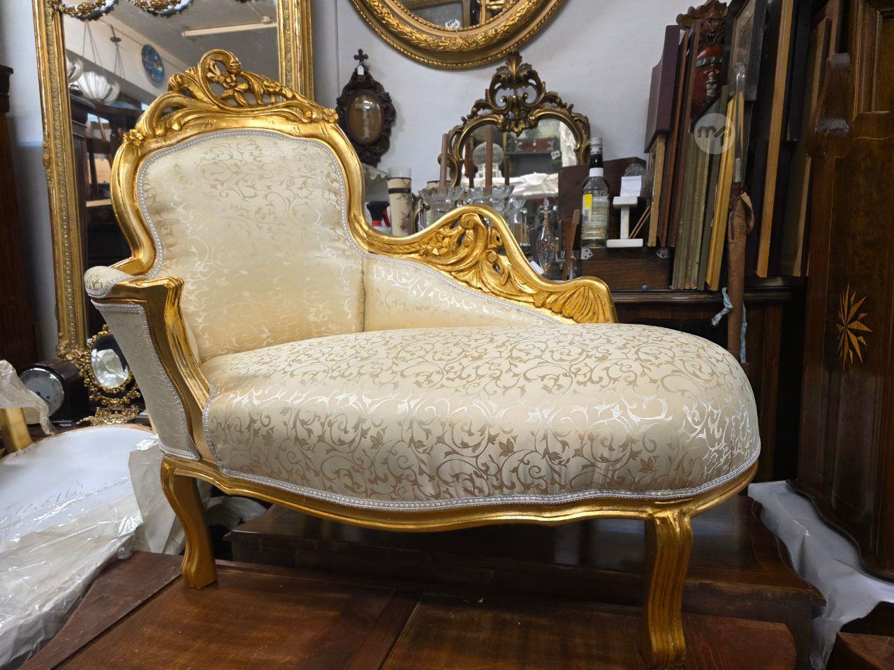 A beautiful gilded upholstered chaise lounge. Measures 120 cms wide x 9