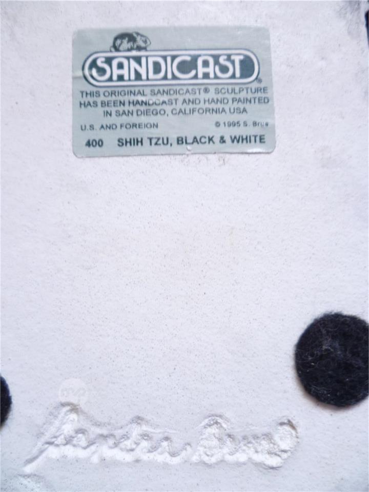 VINTAGE 1995 SANDICAST REALISTIC CHARCOAL BLACK / WHITE SANDSTONE SHIH TZU DOG FIGURINE - SCULPTURED , HAND CAST & HAND PAINTED IN NATURAL FINISH & SIGNED BY ARTIST SANDRA BRUE IN 1995 IN SAN DIEGO , CALIFORNIA , USA