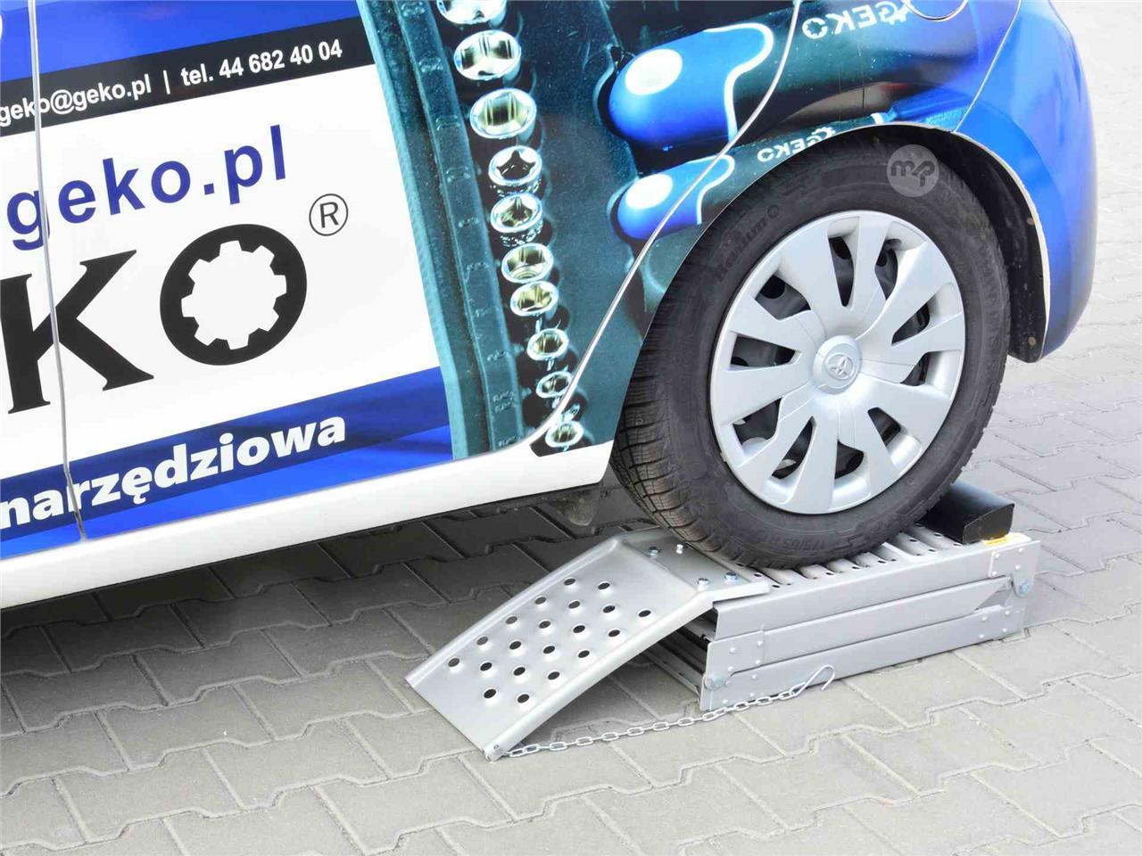GEKO ramp kit, includes two folding heavy duty ramps for cars or motorbikes with tire width up to 225 mm. These dual purpose steel car ramps can be used as a loading ramp up to 550mm or as a car ramp riser for heights of 155 mm. Increased grip and safety due to perforated surface.