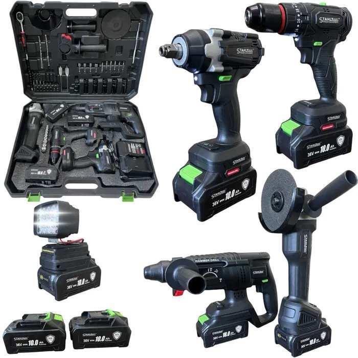 Cordless set 5in1, wrench, screwdriver, angle grinder, perforator, LED lamp - 36v 10.0A, STAHLMAYER