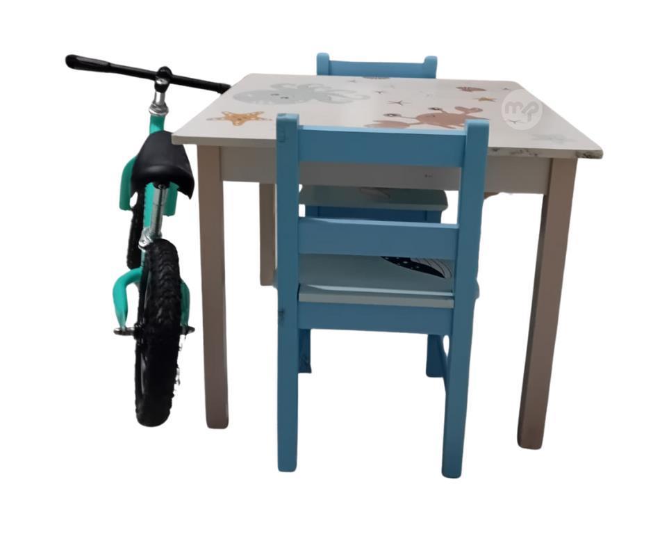 Cute wooden children’s table (60×60 cm) + 2 matching blue chairs with adorable octopus, crab & starfish design.