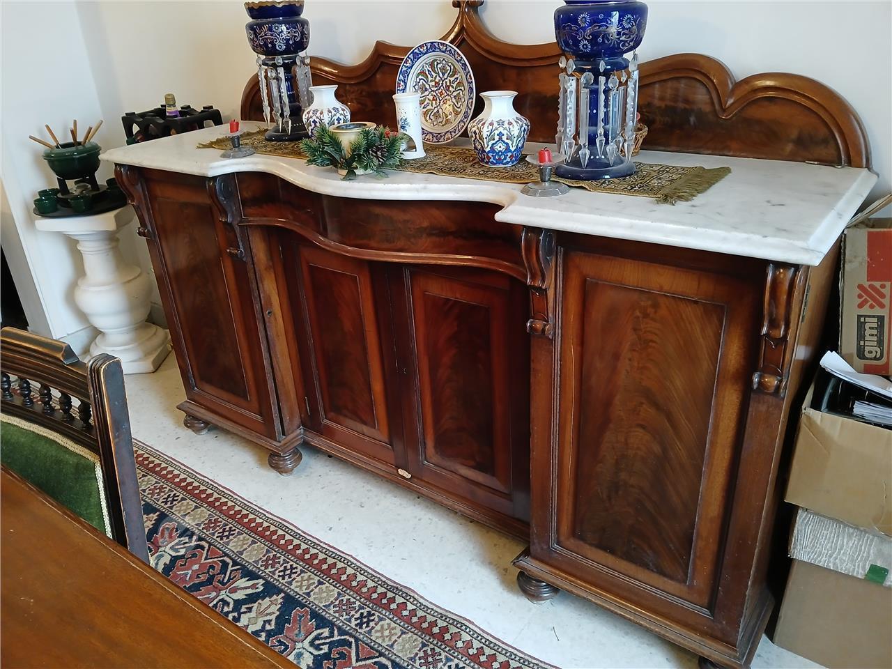 Victorian dining room set - sideboard with marble top, showcase, solid dining table with four chairs.