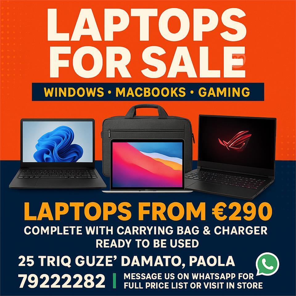 We’ve got a wide selection in stock — Windows, MacBooks, and Gaming laptops — all fully checked, ready to use, and starting from €290. Every laptop comes with a carrying bag + charger included.