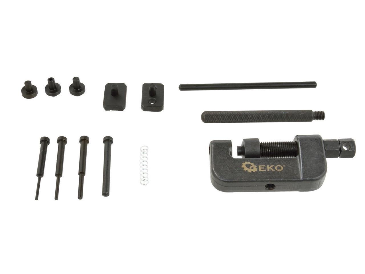 Motorcycle chain crimping and riveting tool. Designed for crimping and separating timing chains and drive chains. This set is useful in motorcycle, bicycle, and automotive workshops.