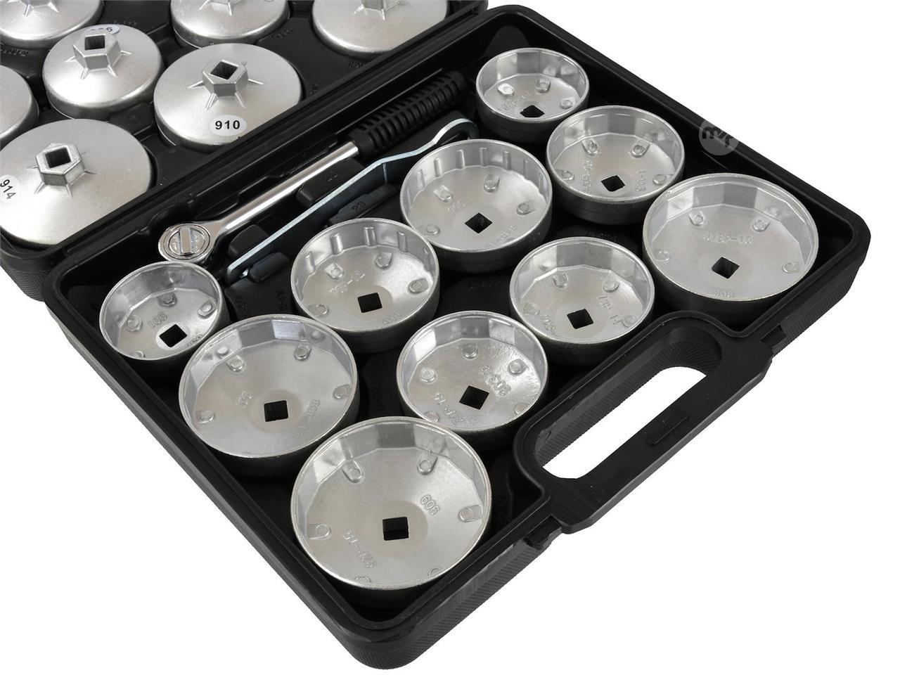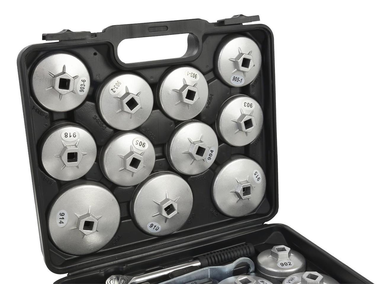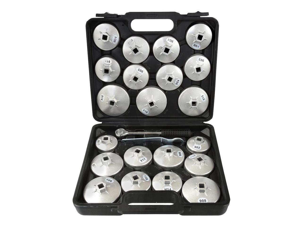 A set of 21 oil filter sockets. Fits most passenger cars manufactured in Europe, the US, and Asia.