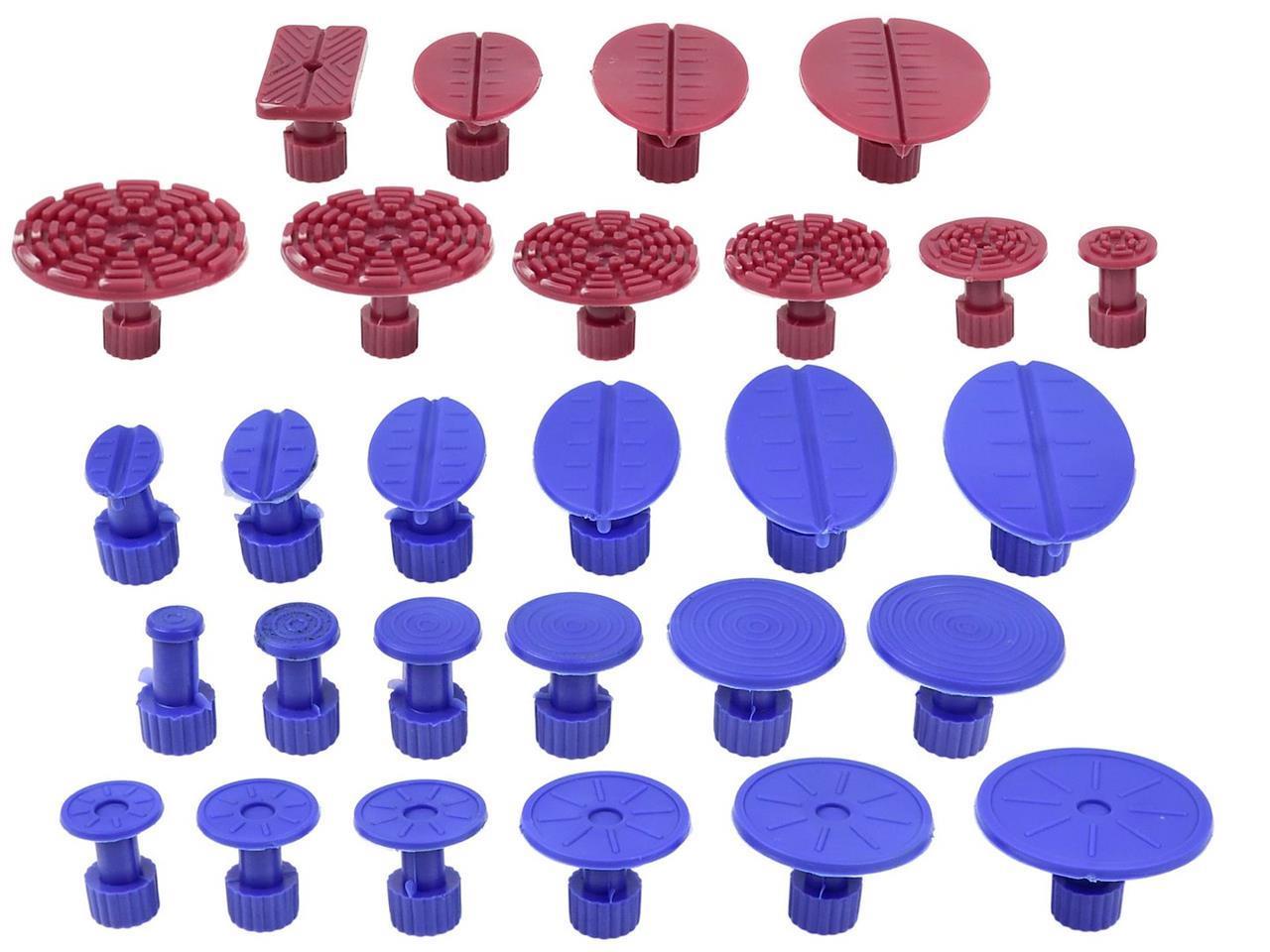 Repair kit designed for removing dents from car bodies. The kit is easy to use and, most importantly, 100% safe for car paint. The kit includes a dent removal hammer, a set of 28 mushrooms of various shapes and sizes, 7 hot melt glue sticks and a glue removal spatula.
