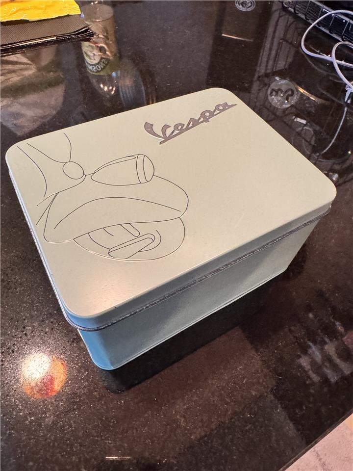 Own a charming piece of Vespa history! This is a classic, Vespa-branded metal tin in excellent condition, ready to bring a touch of Italian style to your home.