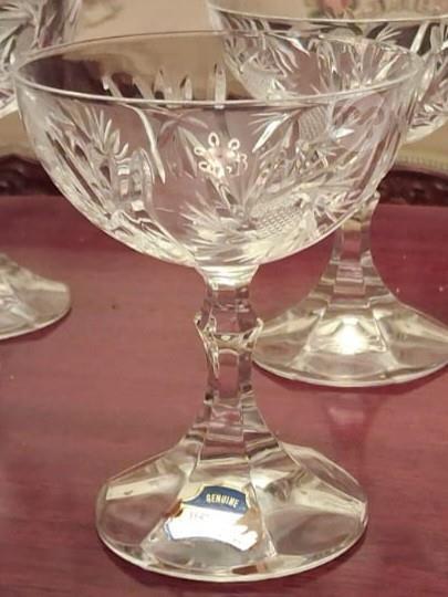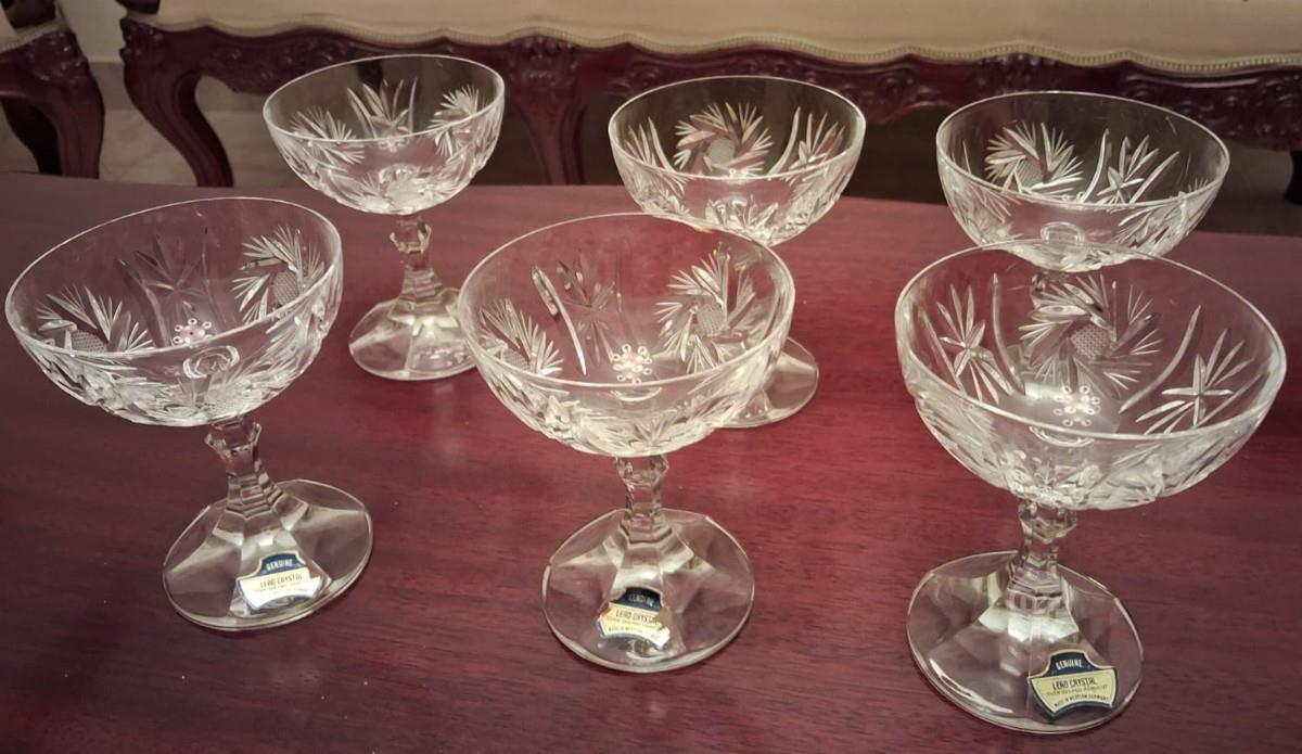 Genuine lead stemmed six champagne crystal glasses, never used "only display showcase."Over 24 percent PBO handcut. In mint condition.