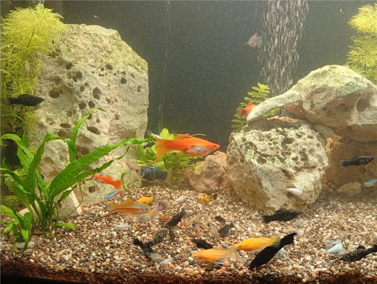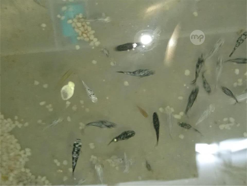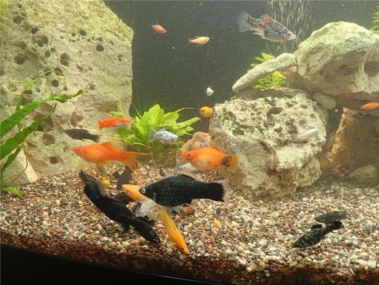 Young fish such as ,mollies ( white with black, black with gold spots , black with white spots,