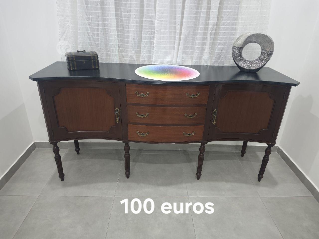 A mahogany sideboard ,two side cabinet and three central drawers with brass handles, 100 euros.