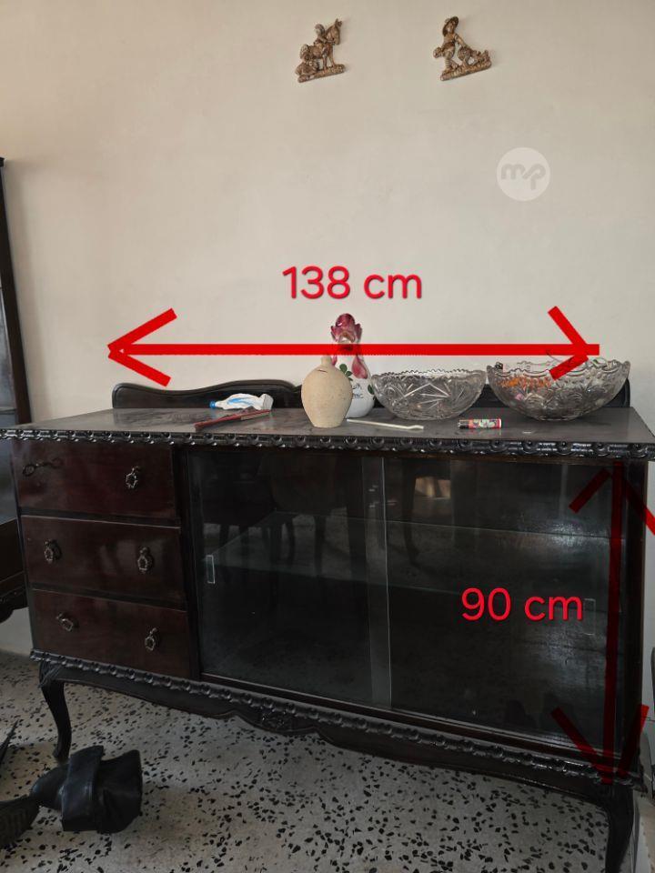 wood sideboard with three drawers and a glass sliding door cabinet section.