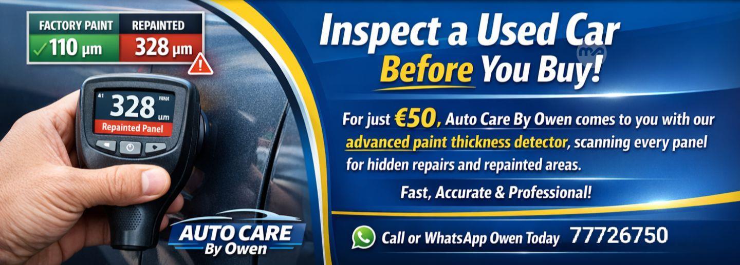 Buying a used car? Don’t get caught off guard by hidden repairs or repainted panels. For just €50, Auto Care By Owen comes to you with our advanced paint thickness detector and scans every panel. You’ll receive a fast, accurate, and professional report, giving you the confidence to buy safely. Peace of mind has never been this easy!