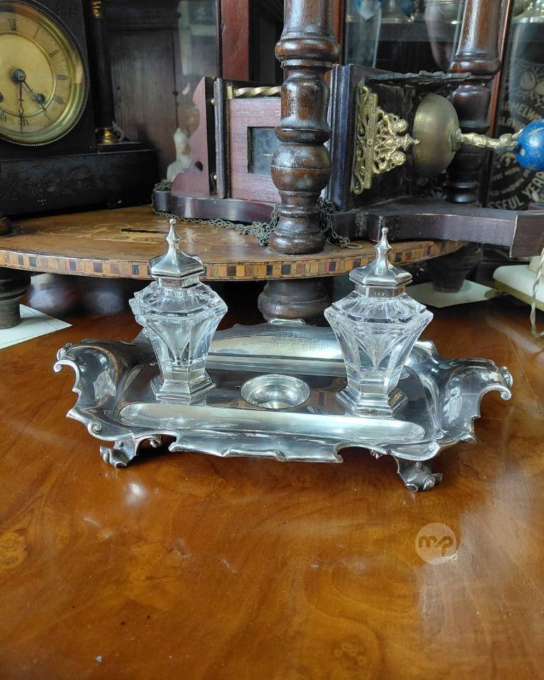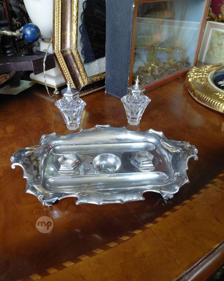 An Antique English Silver Tray double Ink well stand Complete with crystal ink