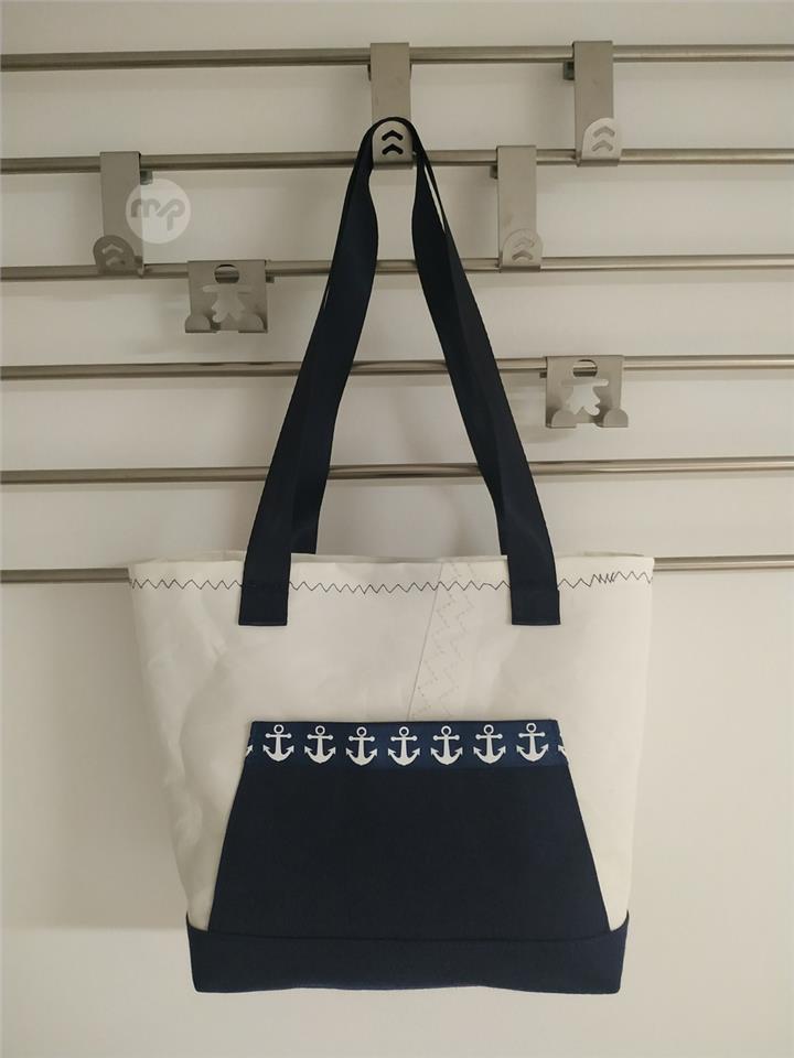 White recycled sailcloth white sewing, bottom recycled blue Sunbrella fabric, one external slip pocket, one internal slip pocket, blue shoulder straps.