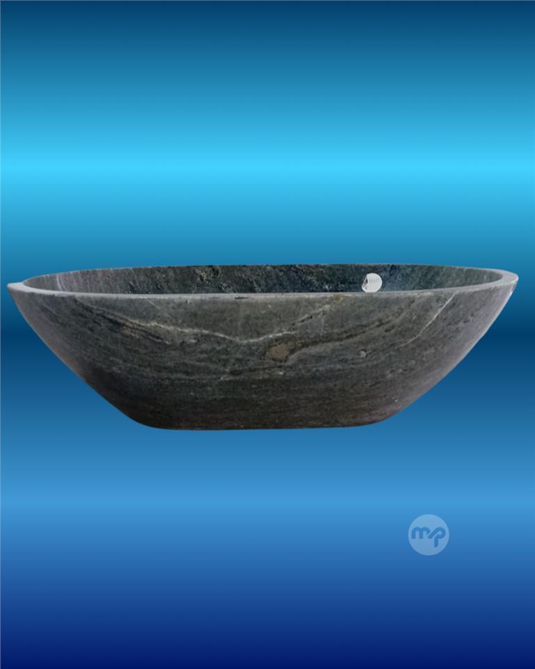 Gorgeous, solid marble countertop basin in stunning dark grey-blue tones with unique natural veining – each piece truly one-of-a-kind. Oval vessel design with smooth polished interior and softly honed exterior for that premium spa feel.