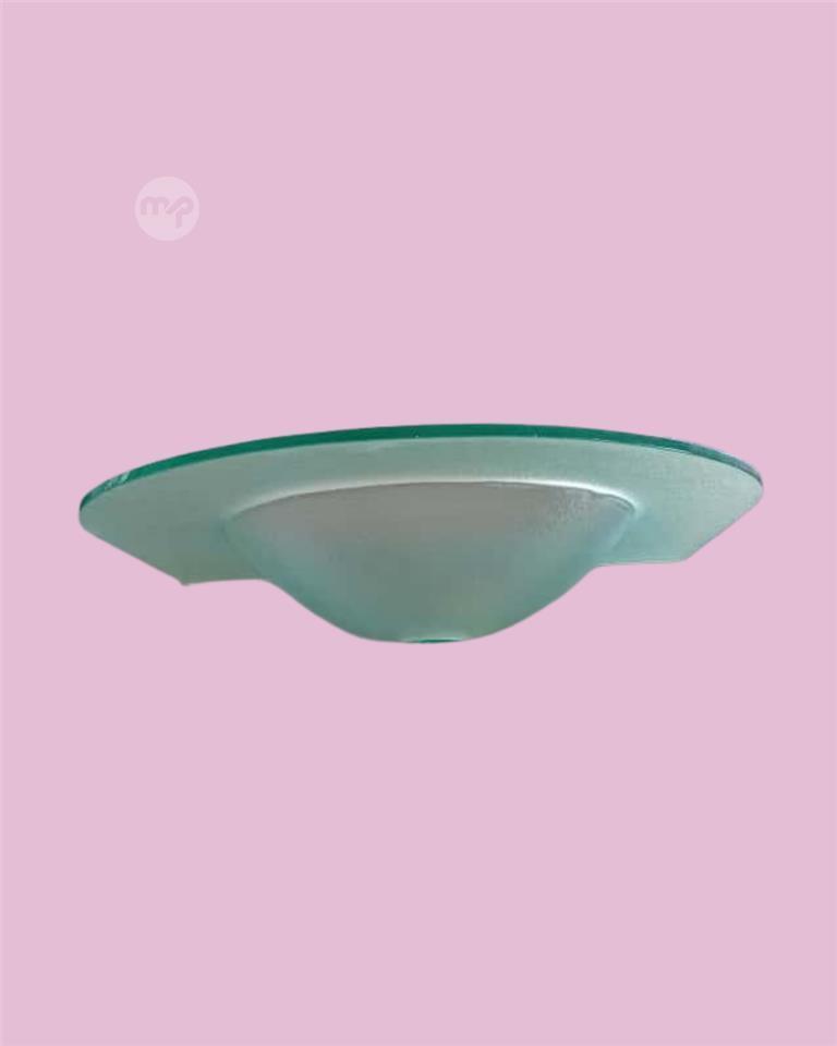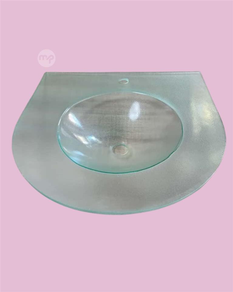 Unique and contemporary frosted tempered glass vessel basin with integrated flat countertop surround – the bowl appears to "float" within the semi-transparent glass surface for a striking modern effect. Curved front edge, pre-drilled tap hole, and sleek minimalist design that plays beautifully with light.