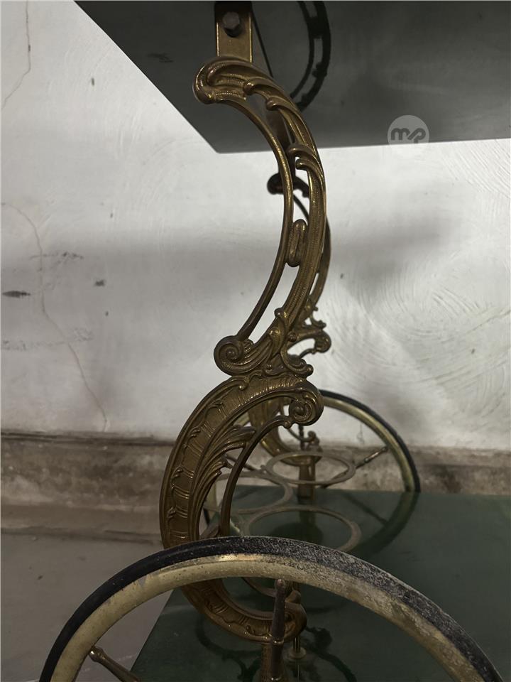 Elegant vintage bar cart featuring ornate brass framework with decorative pierced gallery rail. Two-tier smoked glass shelves provide ample serving space. Classic design with two large wheels and two caster wheels for easy mobility. Graceful curved brass legs with scrollwork details add timeless sophistication.