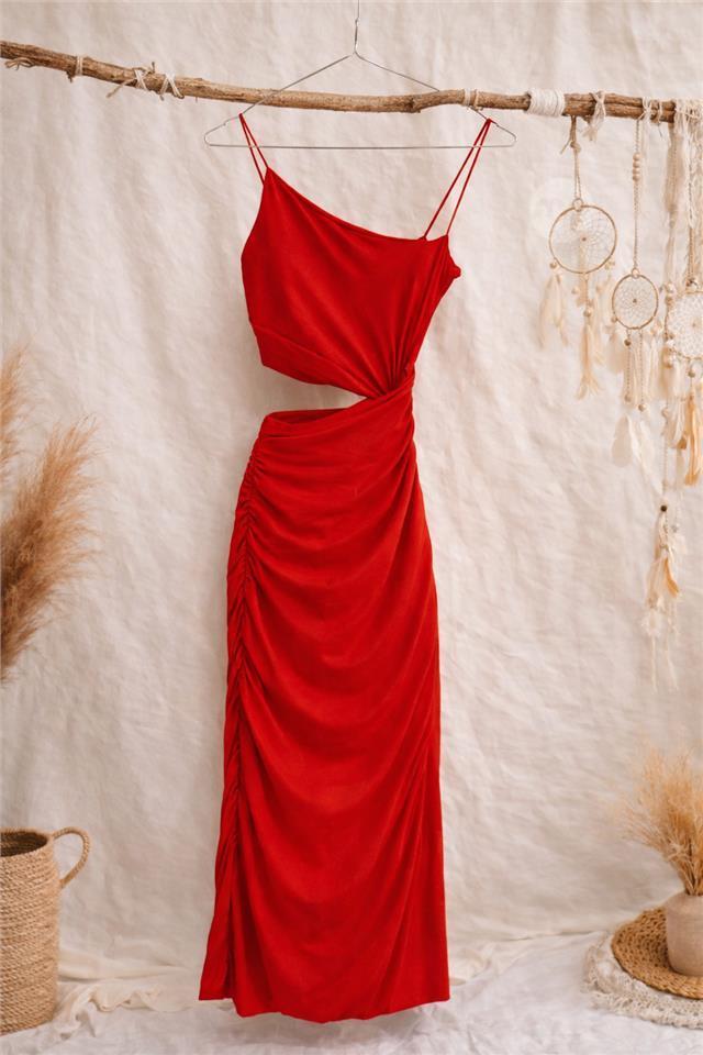Stunning red midi dress by ZARA with a modern, feminine silhouette. The dress features thin straps, an asymmetric neckline, and a subtle side cut-out with elegant ruching that beautifully highlights the waist and figure.
