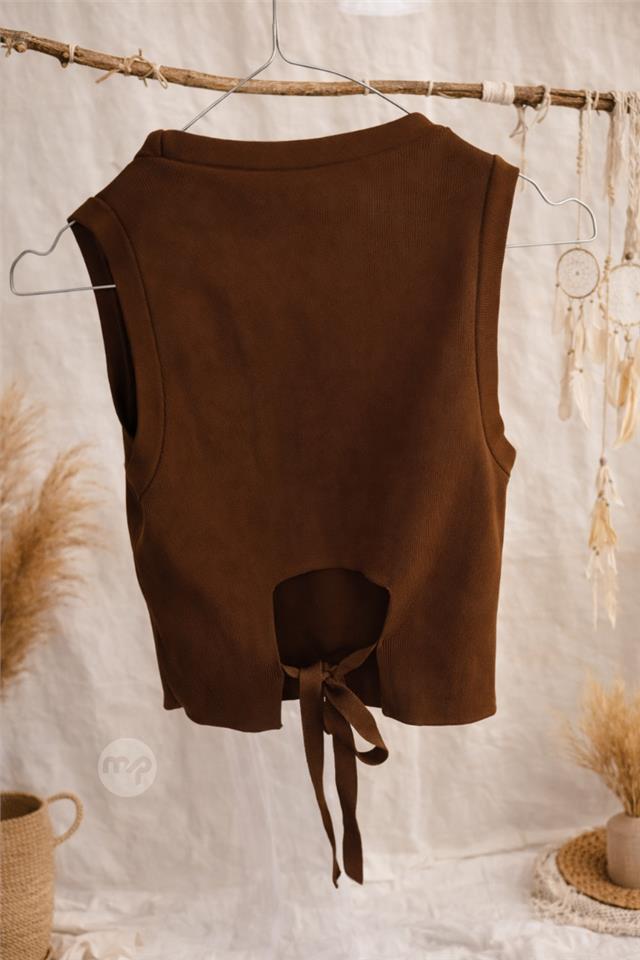 Stylish brown sleeveless ribbed top with a minimalist front and an eye-catching open back detail finished with adjustable tie strings. The classic round neckline and clean cut make it a versatile piece, while the open back adds a modern, feminine touch.