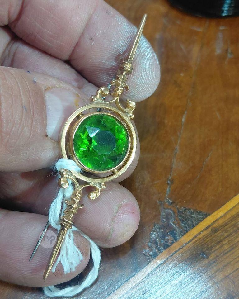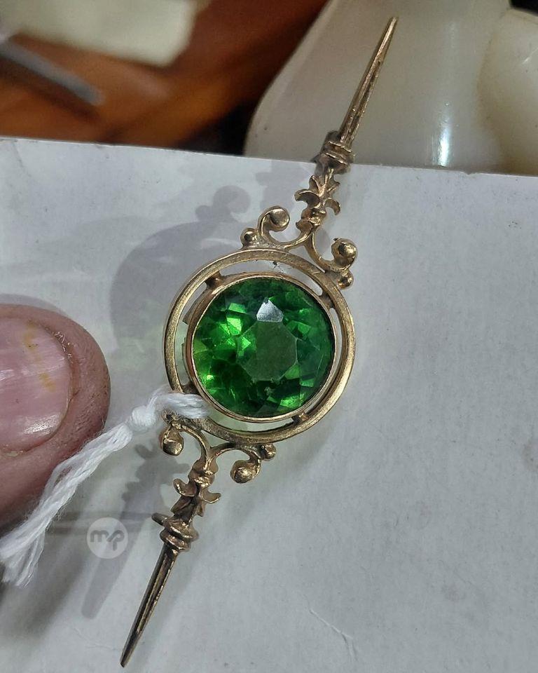 An Antique 19th century 18crt gold brooch, featuring a large, round-cut peridot gemstone.